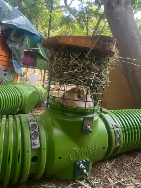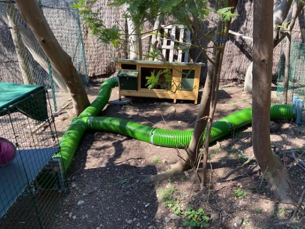Caption: Zippi rabbit tunnels connecting a rabbit run with a wooden rabbit hutch.