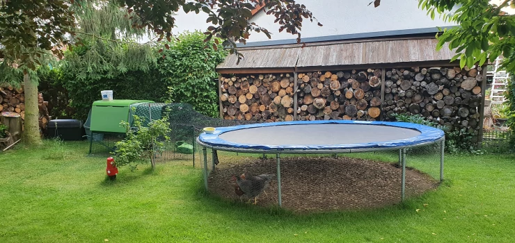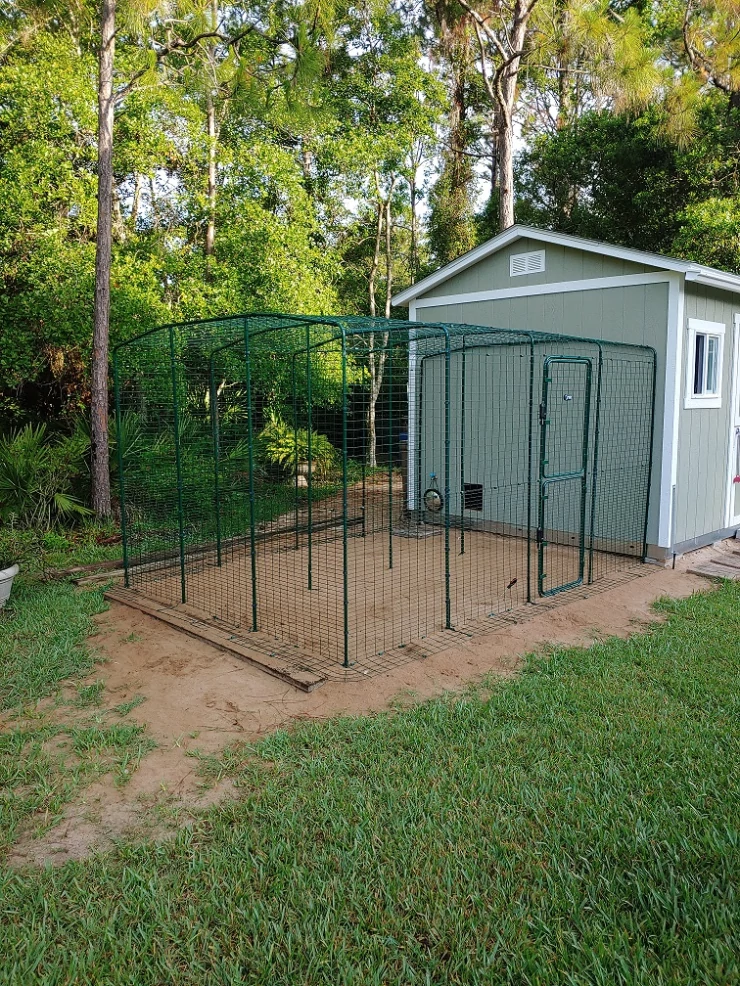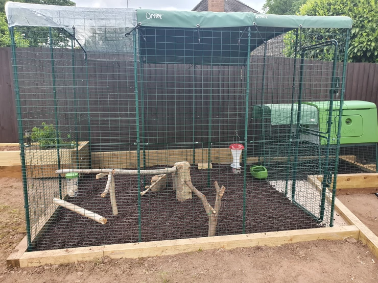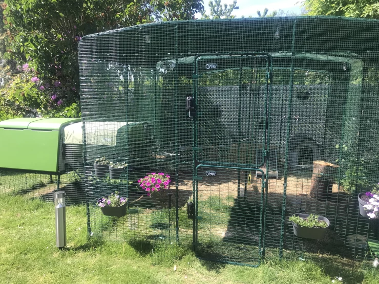 Caption: Green Eglu Cube large chicken coop and run with clear cover in garden