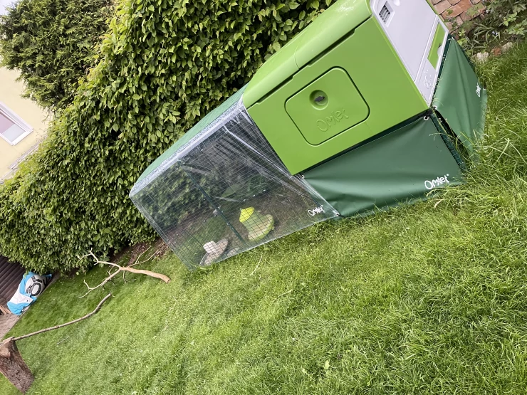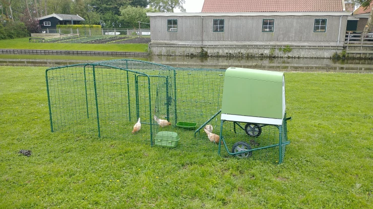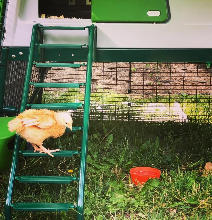 Caption: Green Eglu Cube large chicken coop and run with chick on ladder