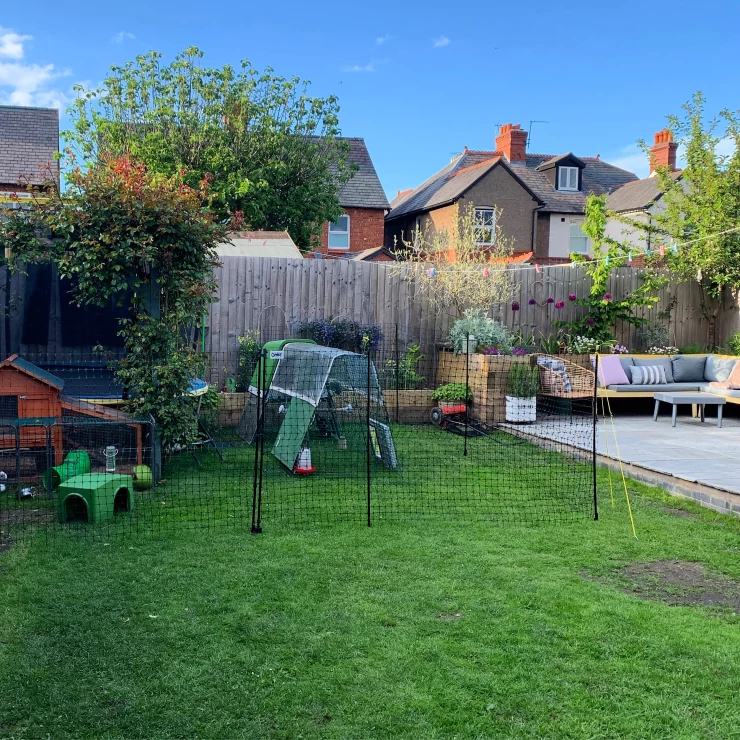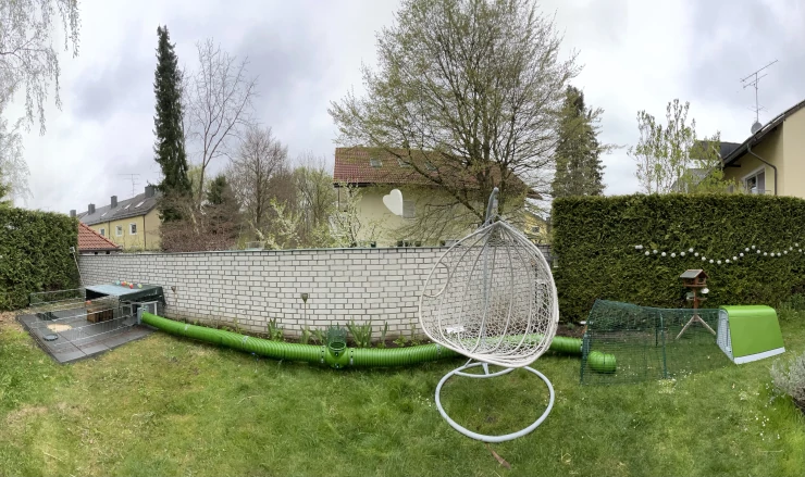 Caption: Green Eglu rabbit hutch with run connected to a run with the Omlet Zippi tunnels in the garden