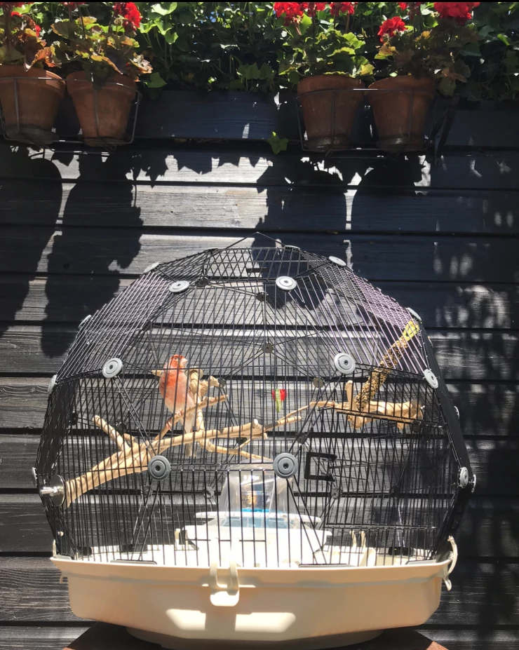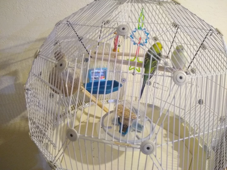 Caption: Budgies in Geo bird cage with white cage and cream base