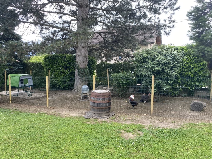Caption: Green Eglu Cube large chicken coop with run with 6 chickens perching on Omlet chicken perch