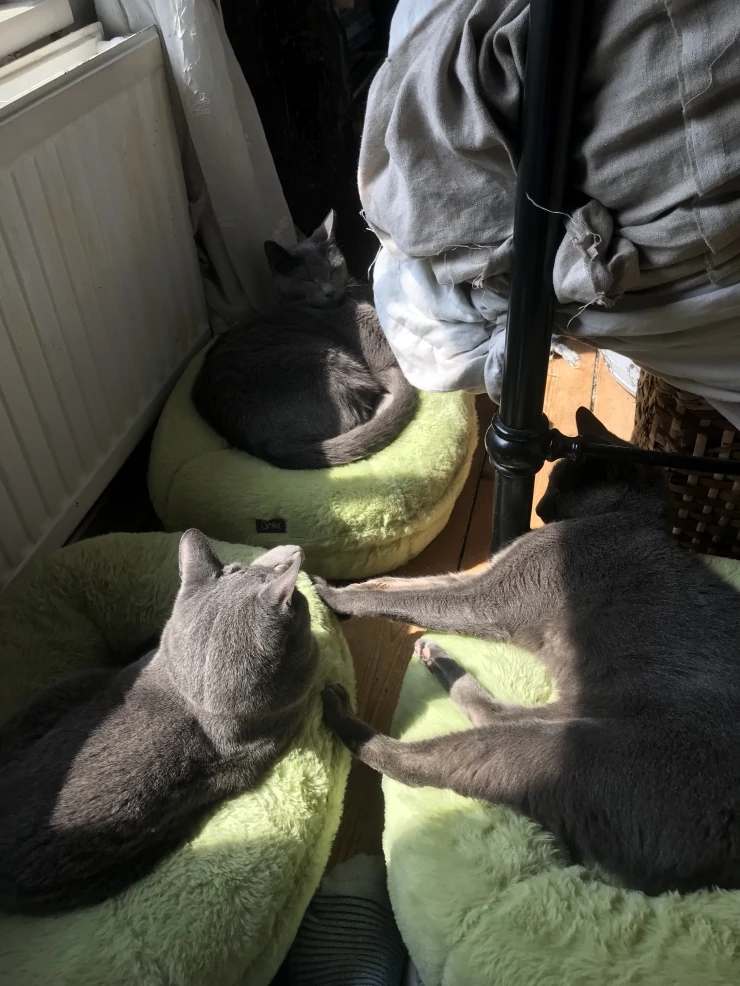 Caption: 3 russian blues in their doughnuts!