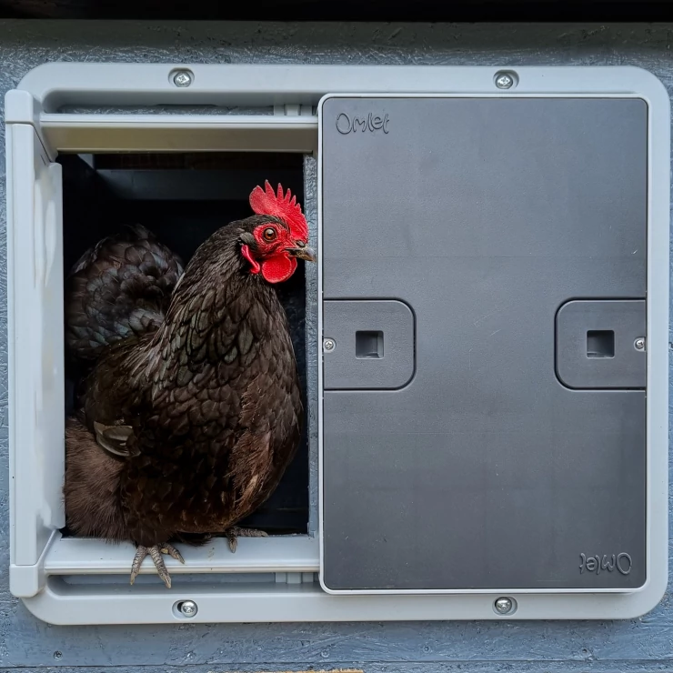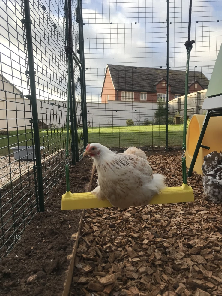 Caption: Odette the orpington is happy to get out of the house on time in the morning and safely inside at night!