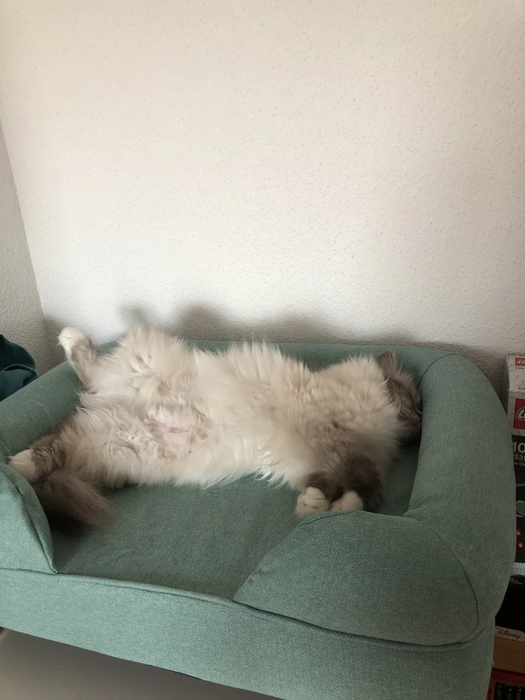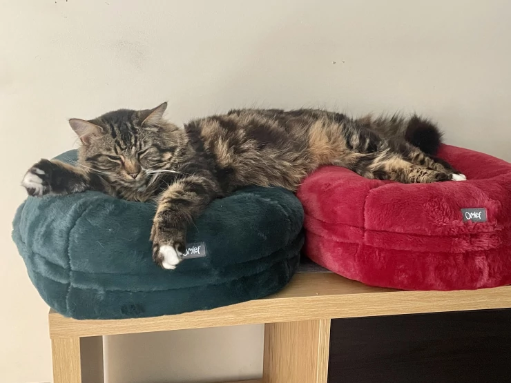 Caption: Cuddles Luxuriating over 2 beds! (he does fit on one)