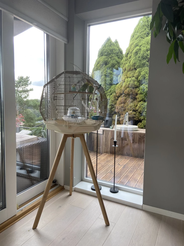 Caption: This is harry on the balcony on the street side b.g where many people walk by including foreigners who all take pictures and want to know everything about the great cage