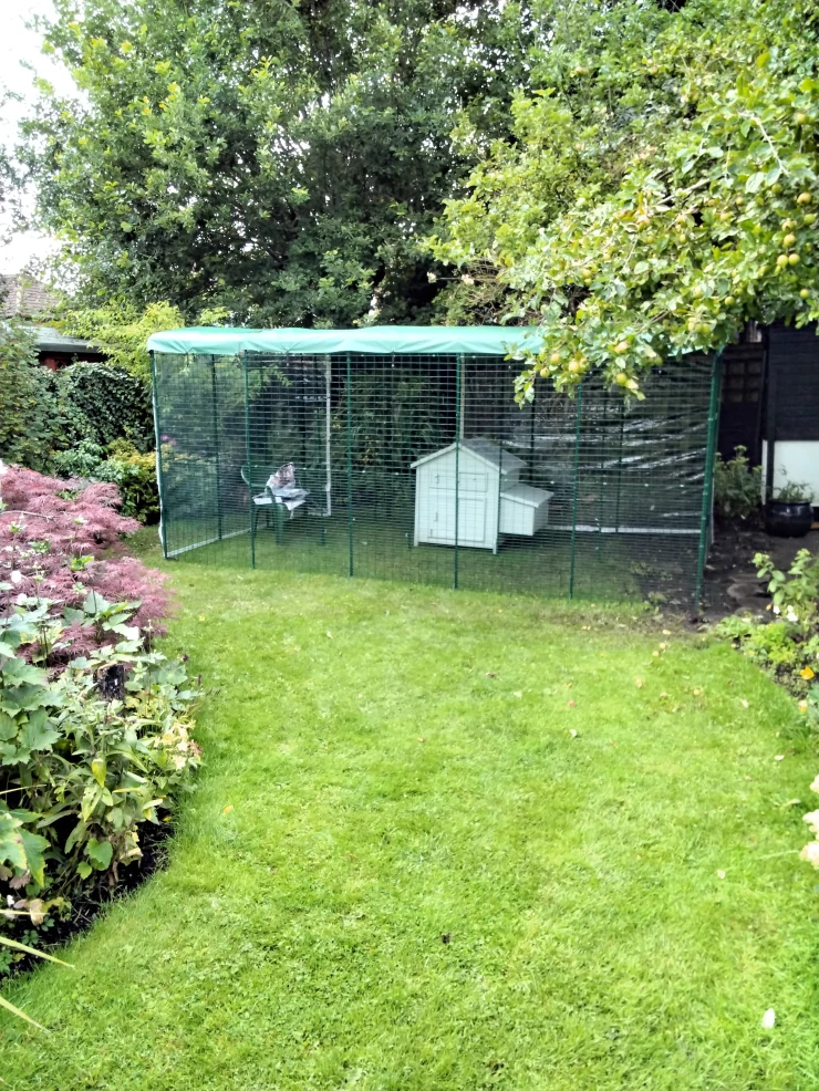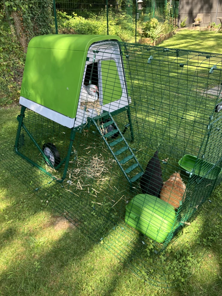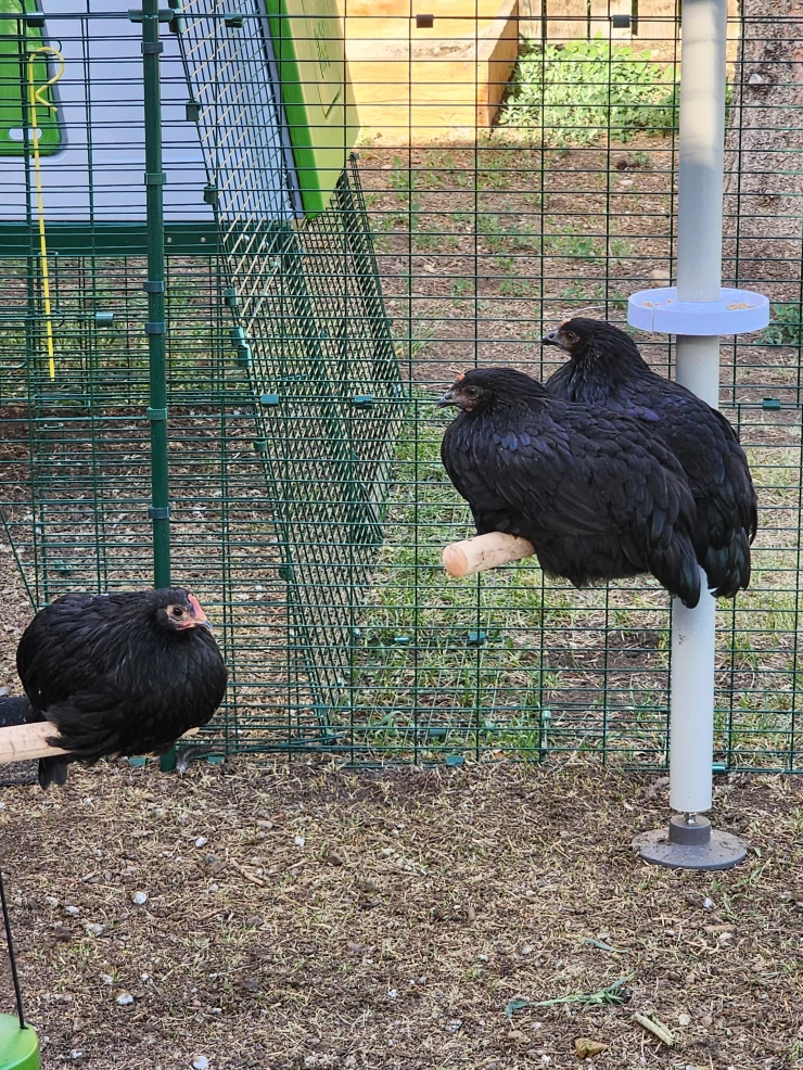 Caption: Two black star and one australorp pullet enjoying their standard pole tree perches.