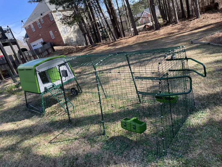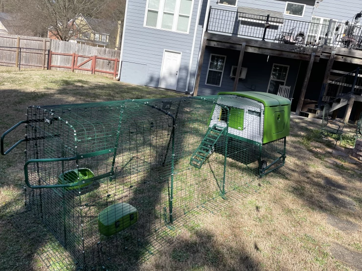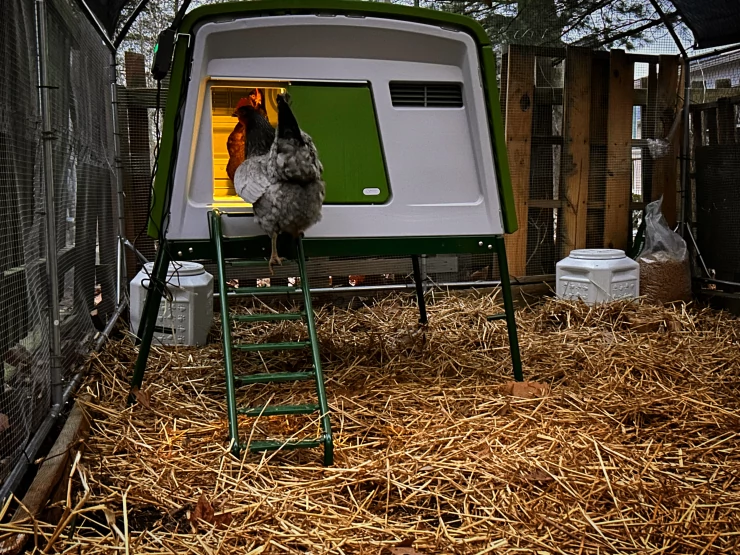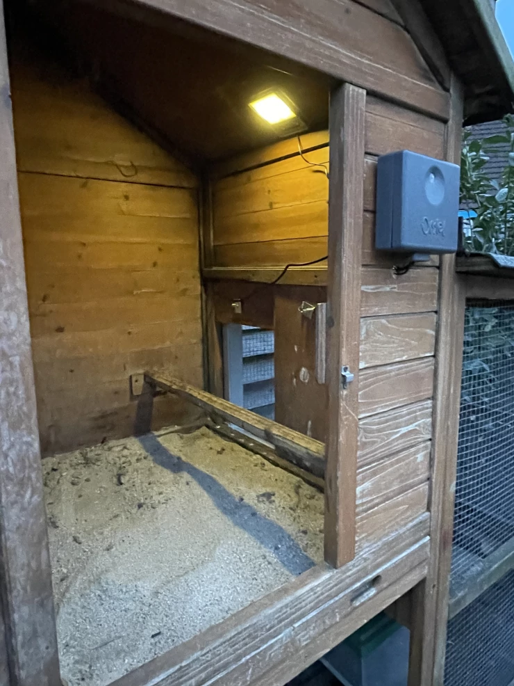 Caption: Door Omlet installed on a large wooden hen house. within 15 minutes, my hens were safe and i was relieved not to have to open and close the door.
